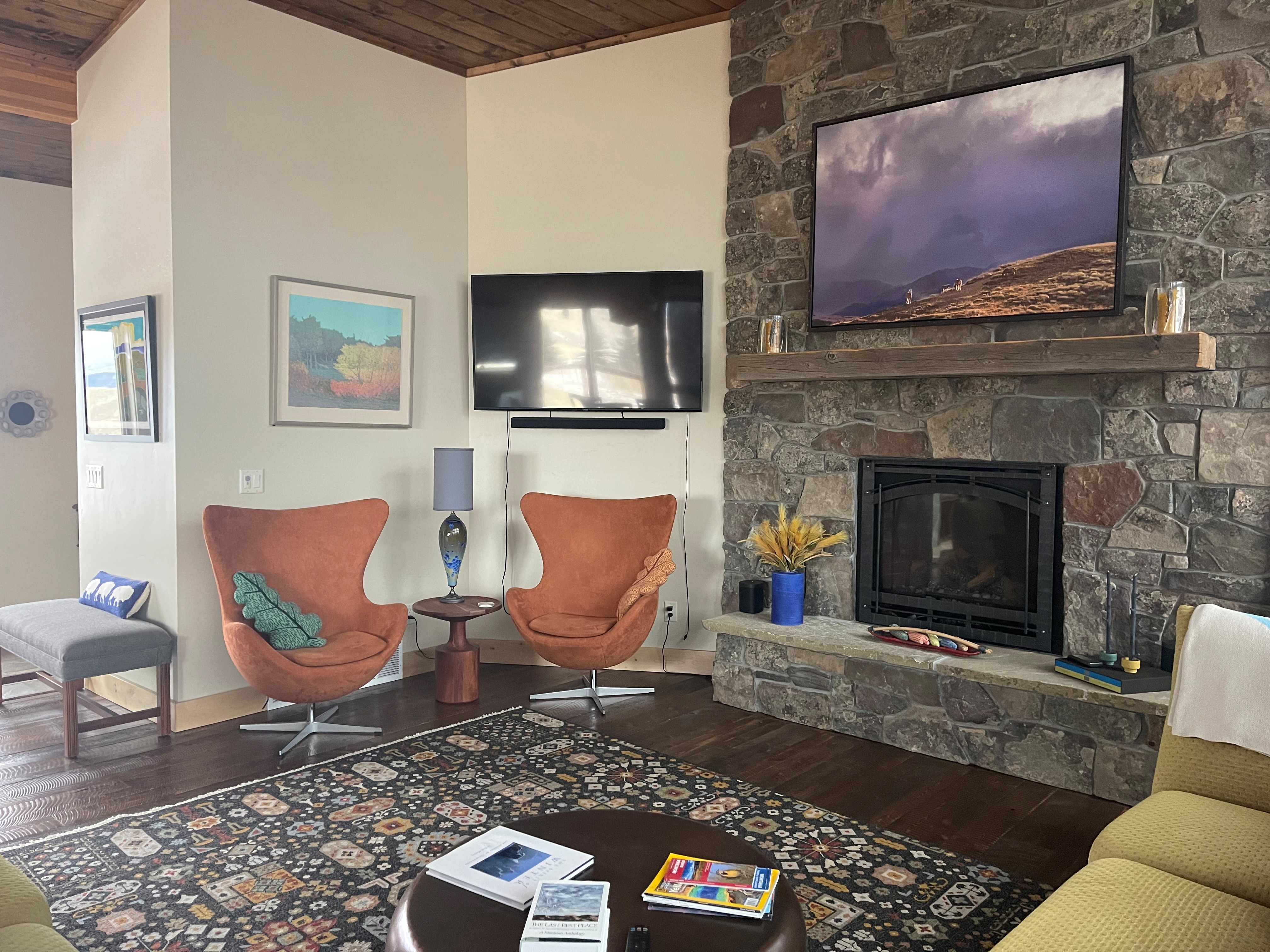 - Cozy sofas and modern chairs for movie nights or curling up by the gas fireplace.