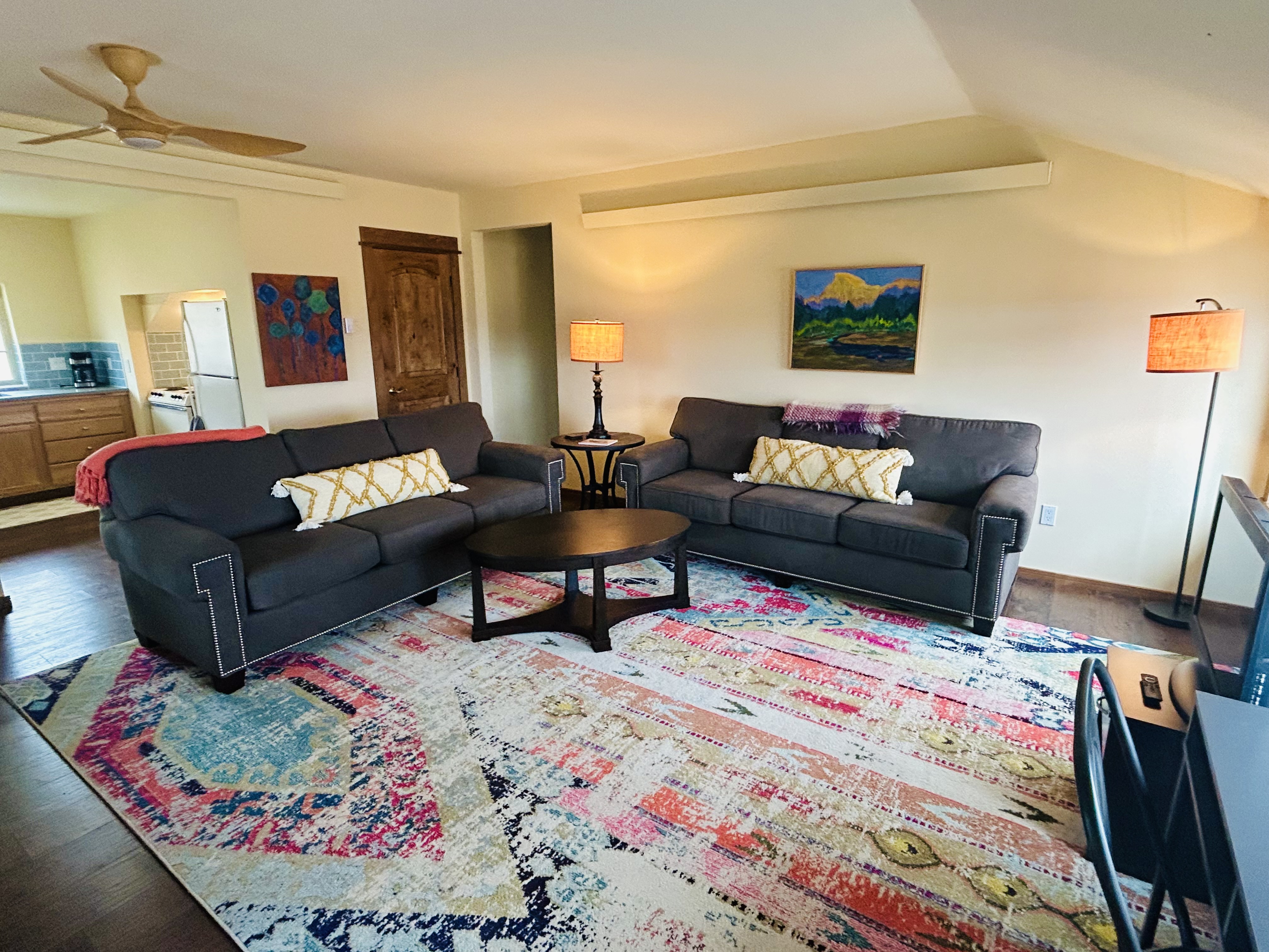 -Additional living room in the ADU with two sofas and flat screen TV.